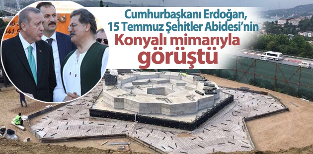 Cumhurbaşkanı Recep Tayyip Erdoğan, 15 Temmuz Şehitler Köprüsü’nün çıkışına yaptırılan “15 Temmuz Şehitler Abidesi“ inşaatında incelemelerde bulundu. Erdoğan, abidenin Konyalı mimarı Muharrem Hilmi Şenalp’ten bilgi aldı. Dünyanın birçok yerinde önemli mimari eserlerin altına imza atan Şenalp, 15 Temmuz Şehitler Abidesi’nin temasını anlattı.